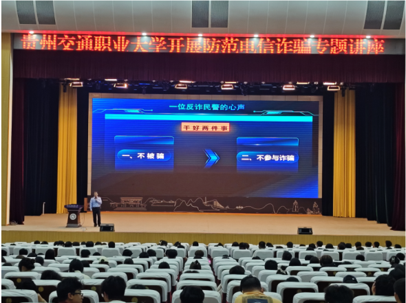 为进一步强化学校反诈宣传教育普及反诈知识,提高师生反诈骗能力维护校园安全稳定。2025年5月21日由平安校园建设办公室(保卫处)牵头,特邀清镇市公安局王道军反诈工作室王道军副所长在我校礼堂为学校1000余名师生开展防范电信网络诈骗宣传教育专题讲座。