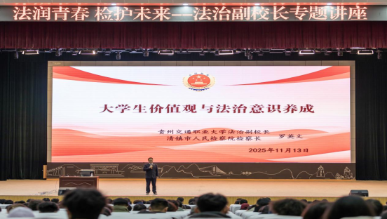 2025年11月13日晚,学校法治副校长、清镇市人民检察院党组书记、检察长罗英文在大礼堂为1100名师生代表带来了一场题为“大学生价值观与法治意识养成”的专题法治讲座。